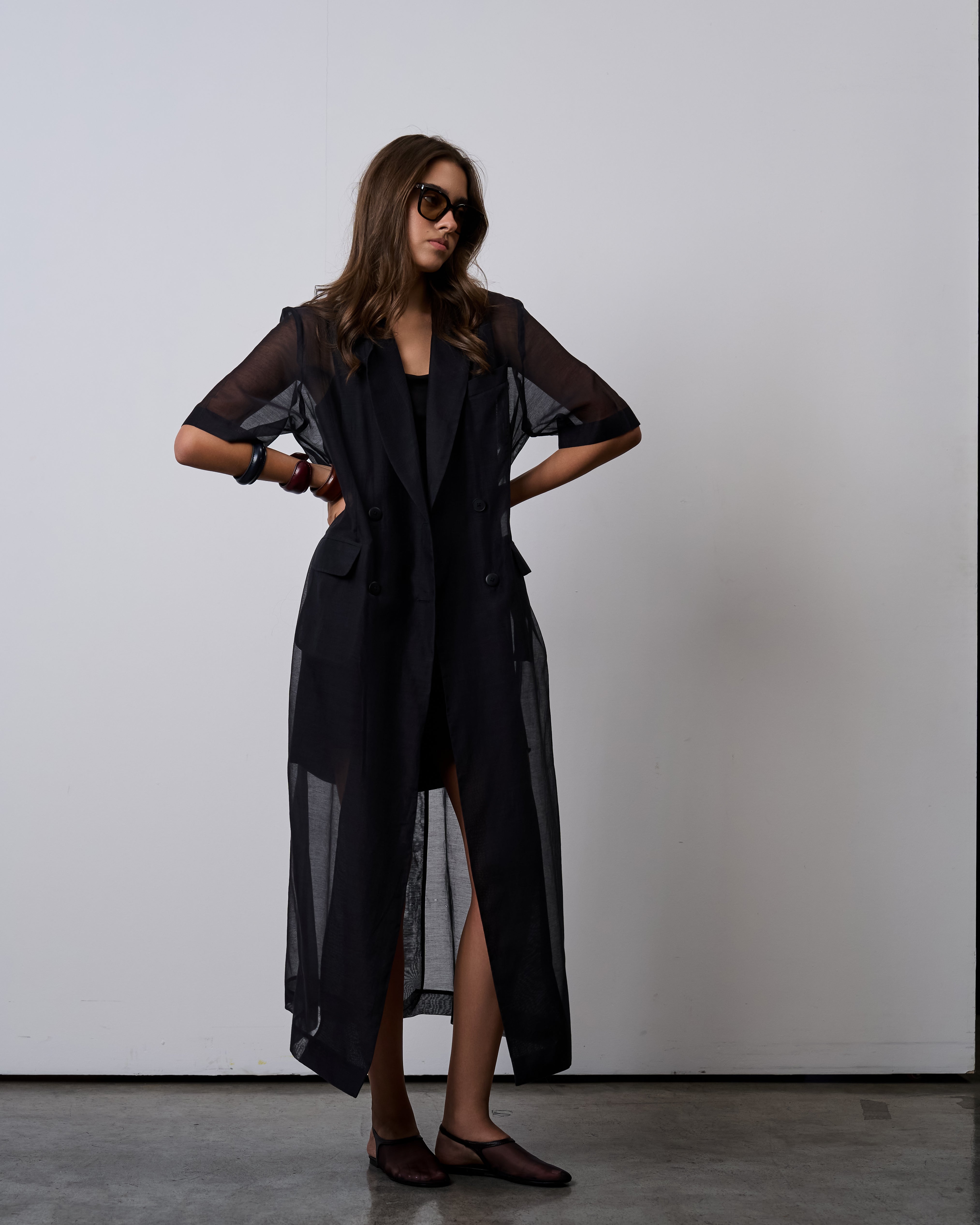 Two piece jacket dress set. Four button sheer silk cotton short sleeve jacket dress with midi cotton jersey sleeveless dress (wide straps)