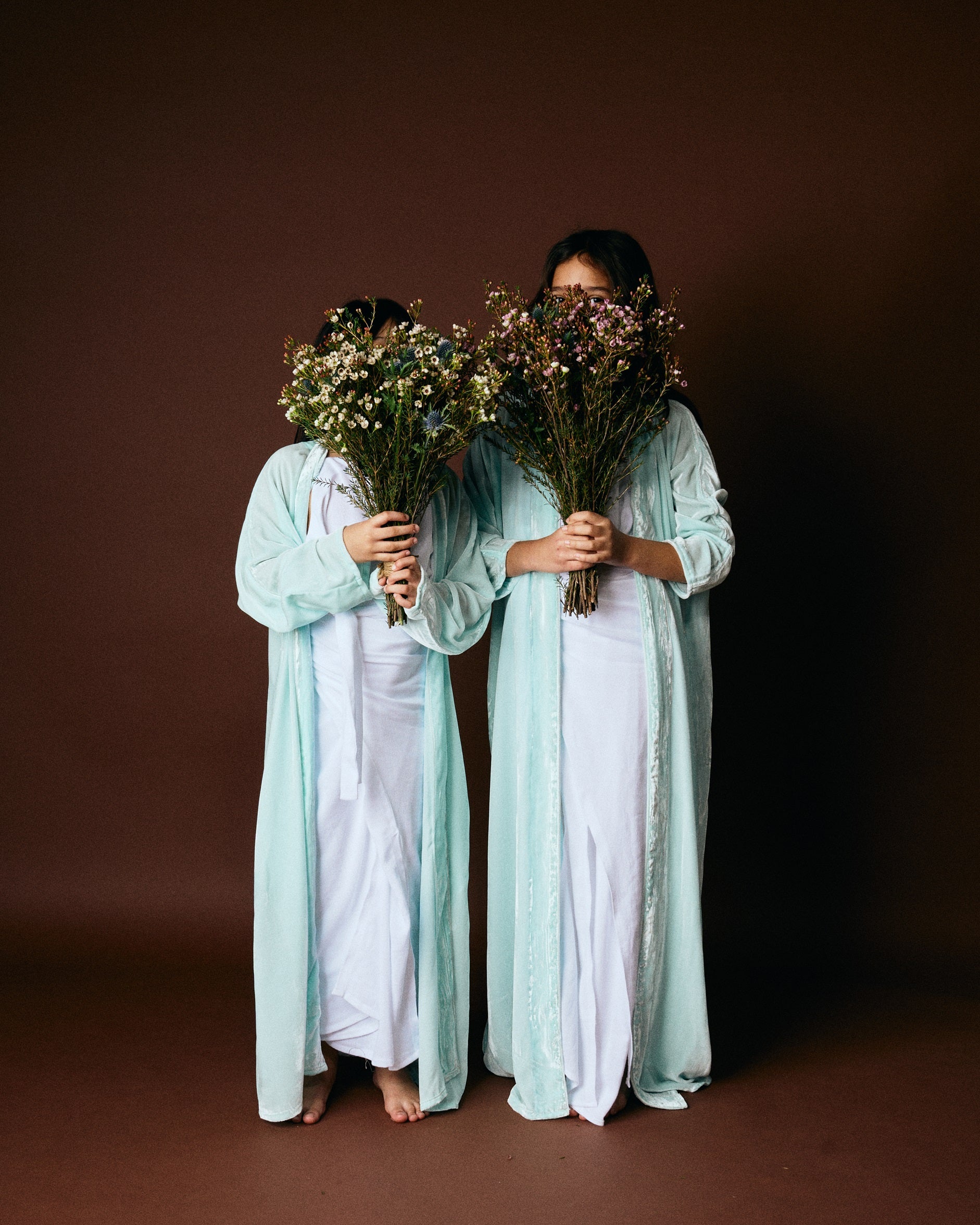Two-piece set, cotton mix wrap dress, velvet bisht