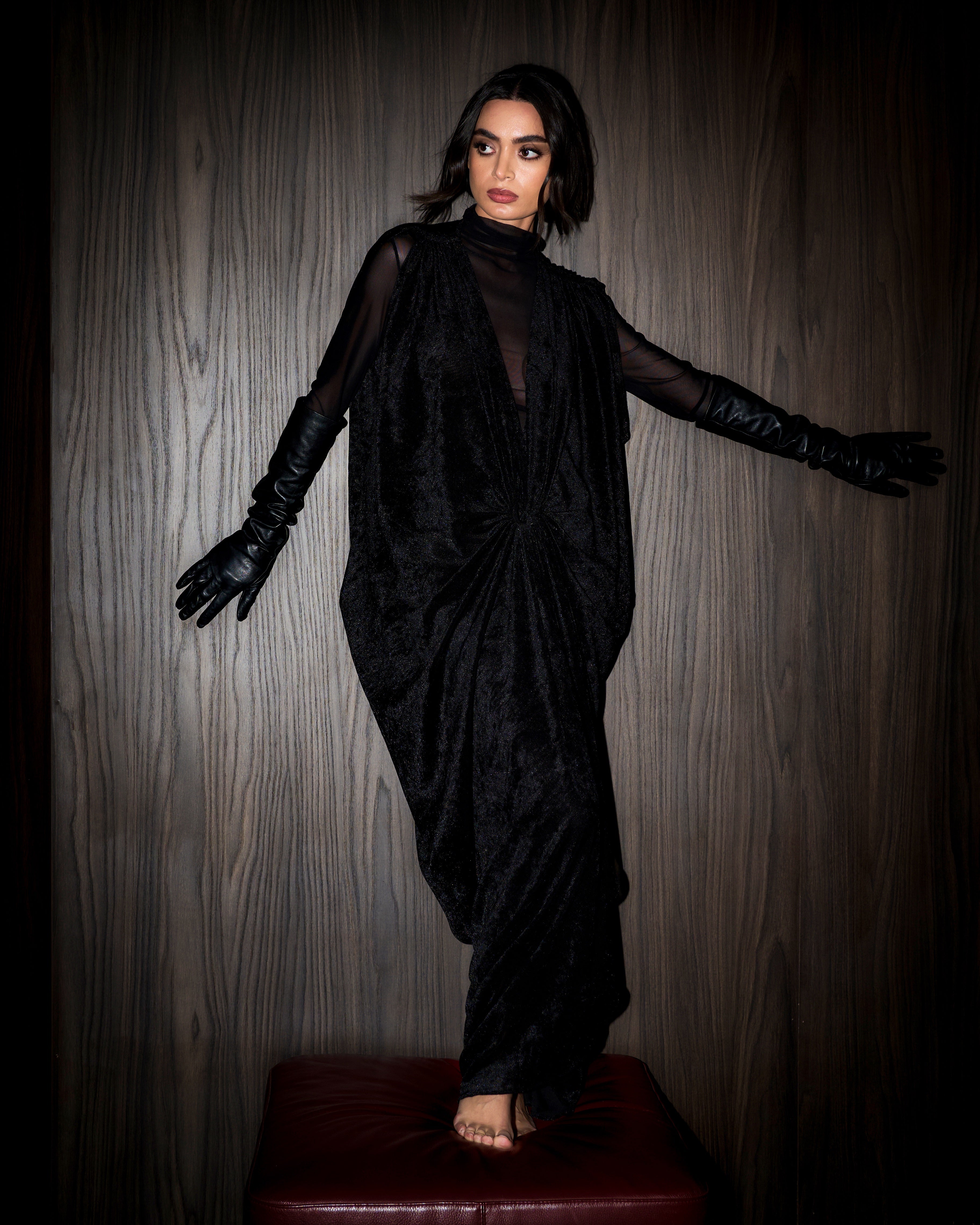 Perforated velvet dress worn over a stretch tulle bodycon long sleeve high neck dress
