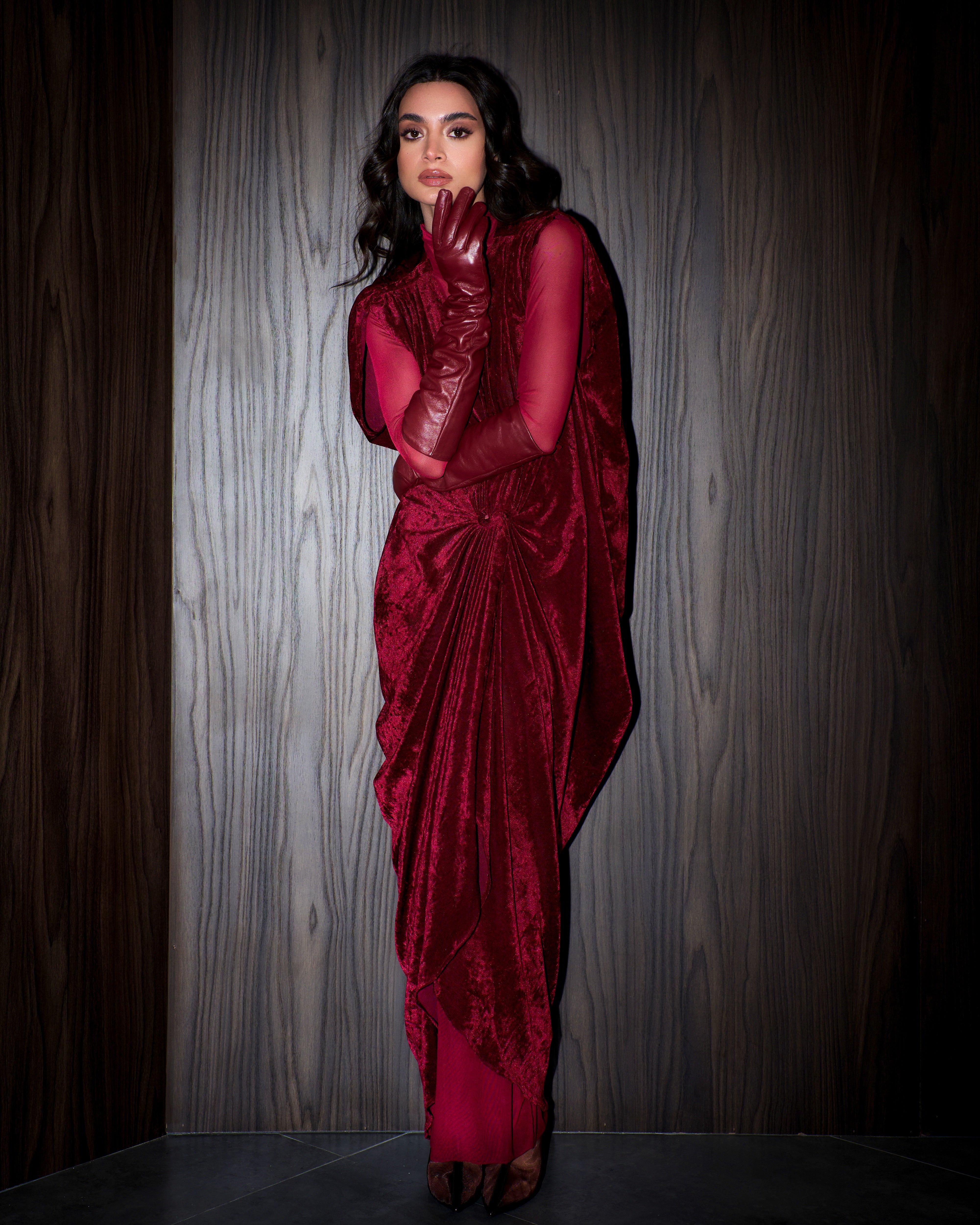 Perforated velvet dress worn over a stretch tulle bodycon long sleeve high neck dress
