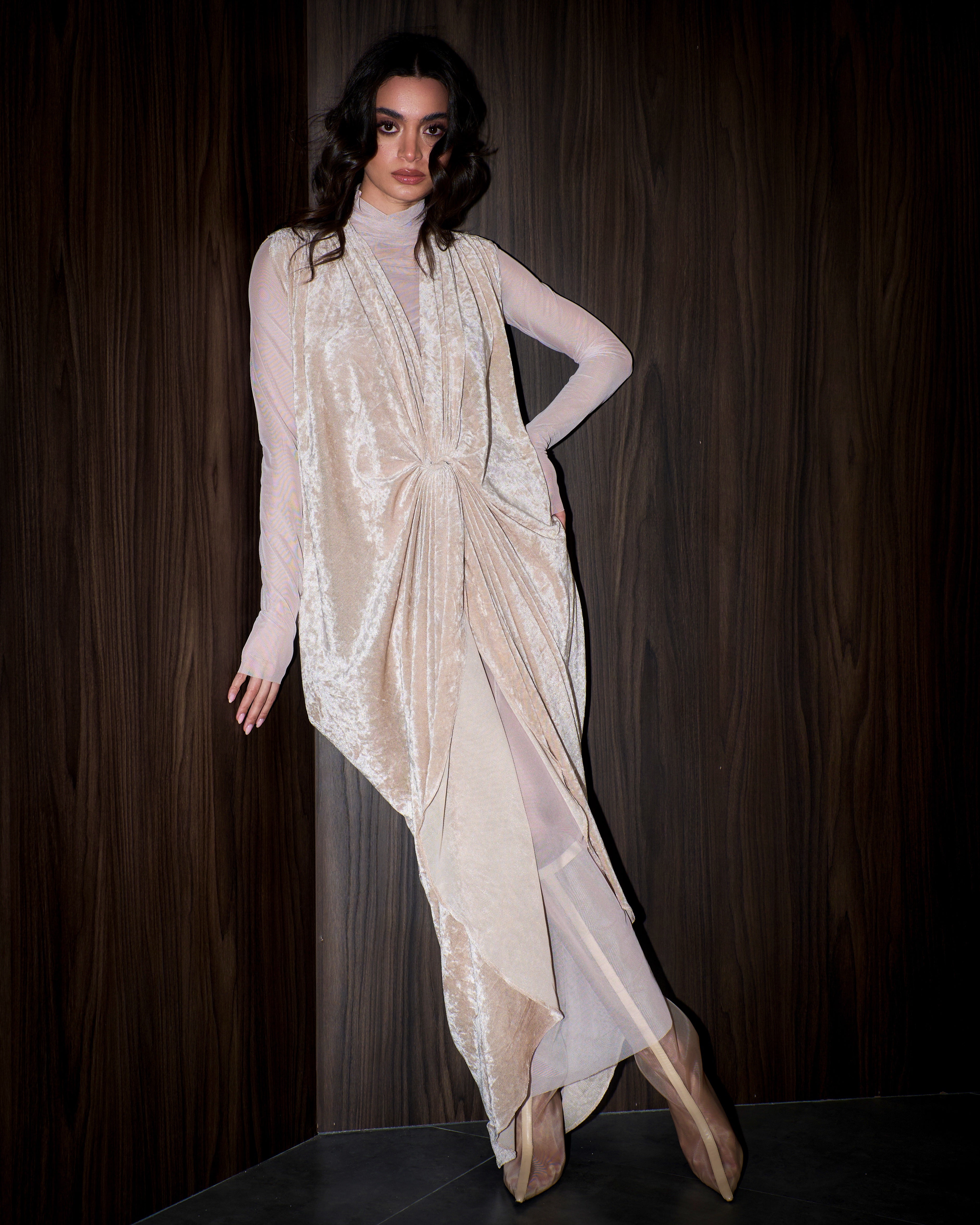 Perforated velvet dress worn over a stretch tulle bodycon long sleeve high neck dress