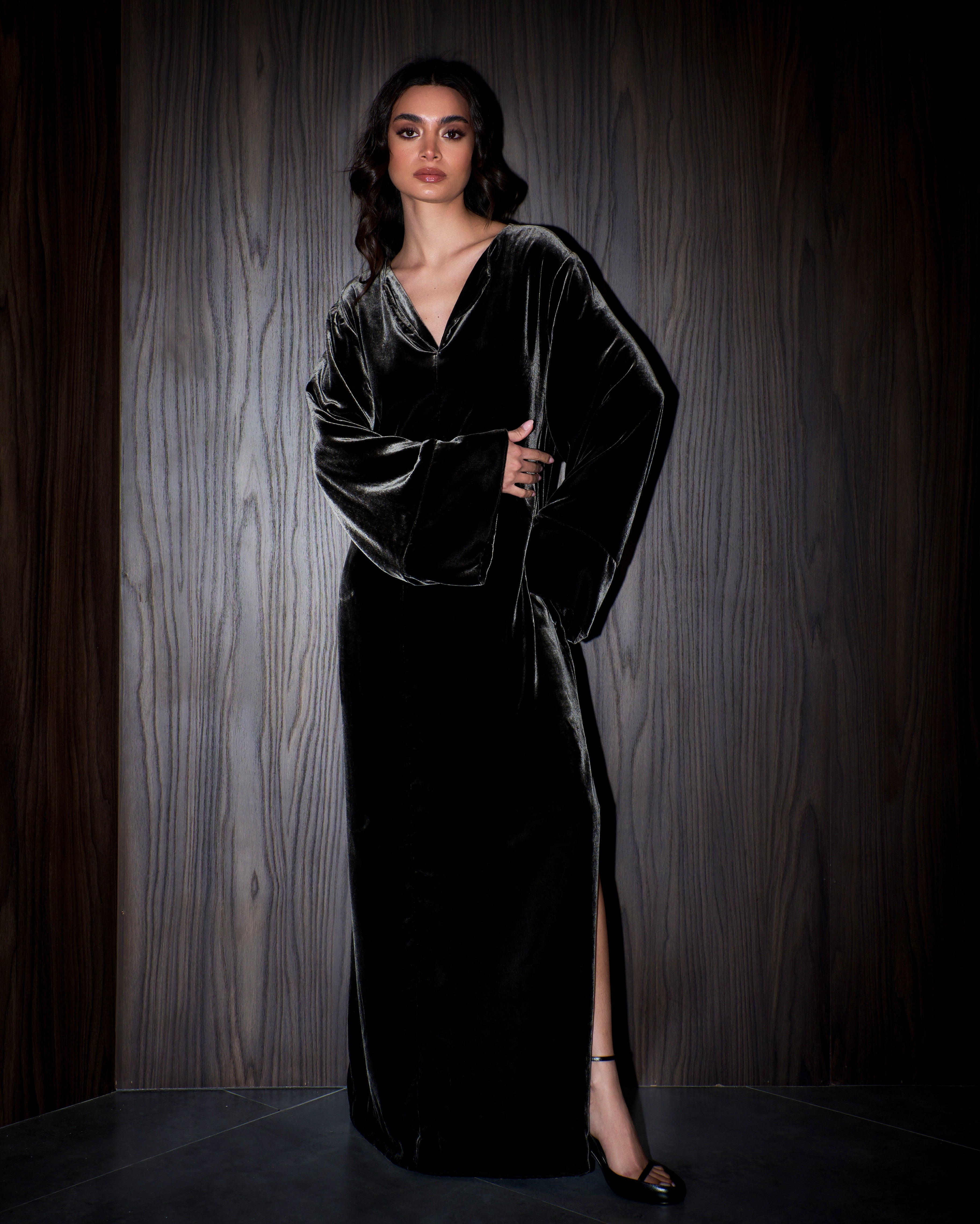 Simple maxi velvet kaftan, long wide sleeves, slits on both sides