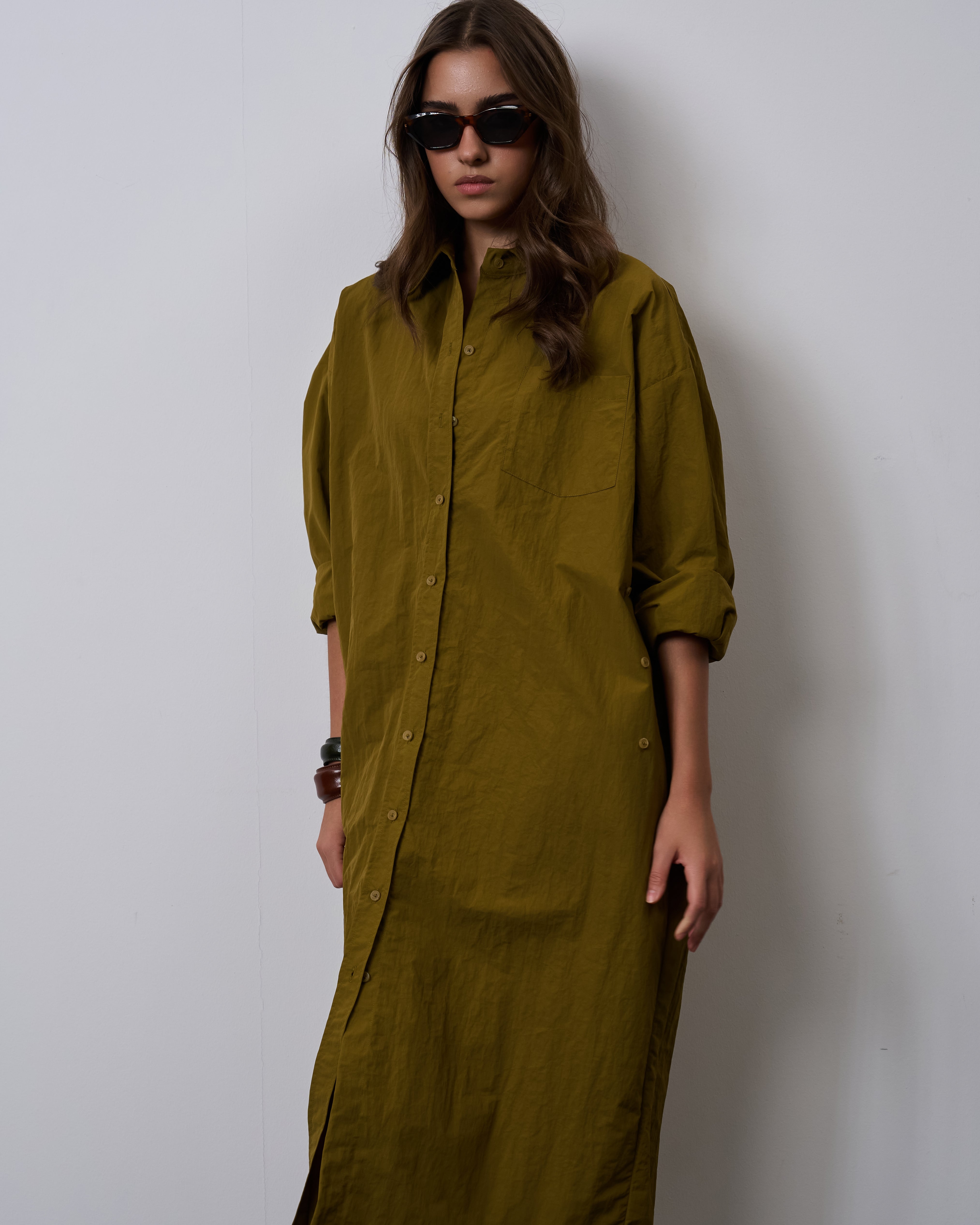 Midi water resistant cotton buttoned dress. Can be worn multiple ways.