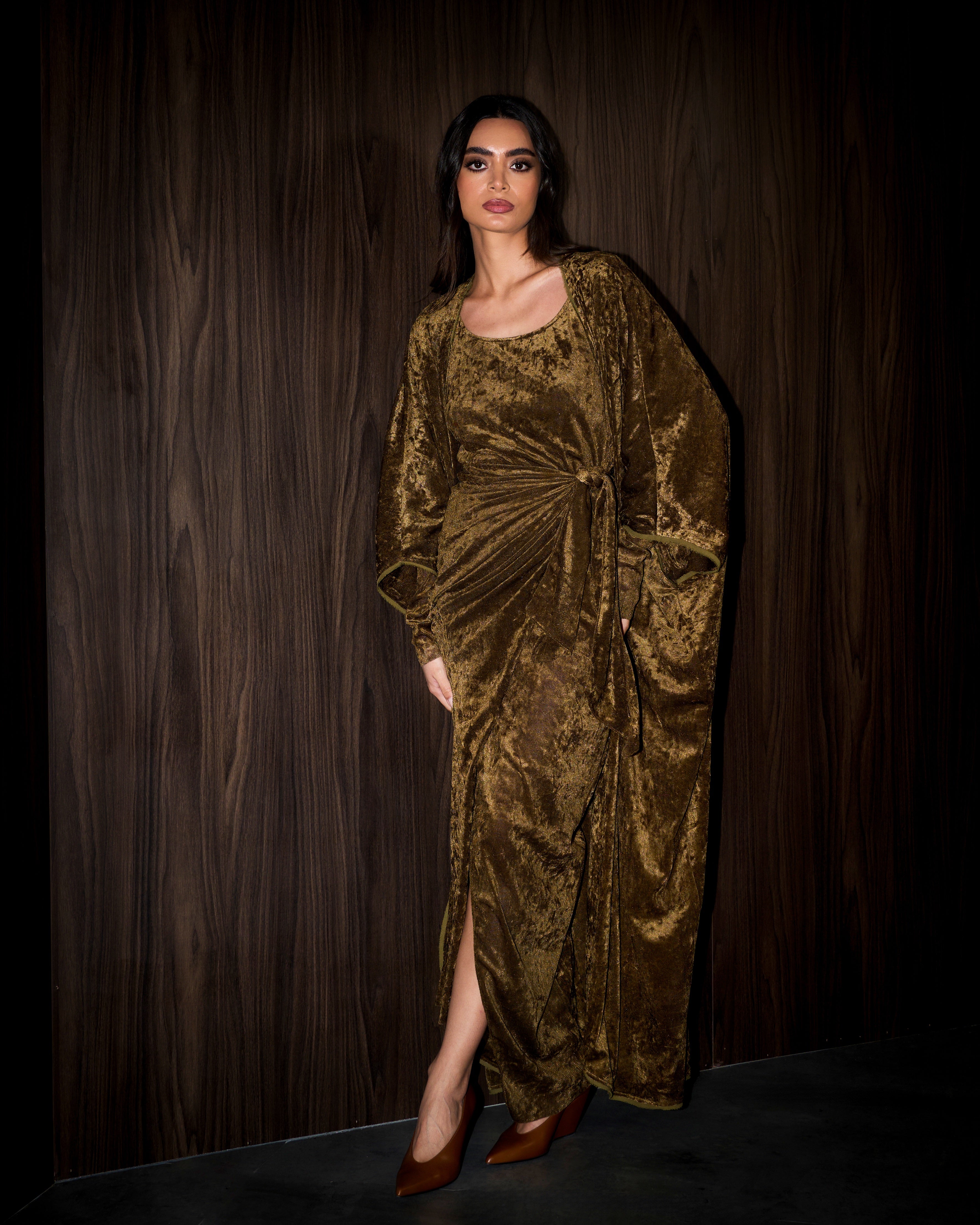 Perforated velvet long sleeve wrap dress with double layered velvet bisht